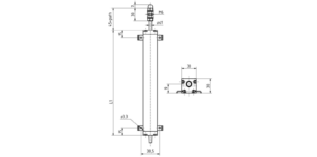 The precision linear potentiometer type LL30 reliably measure linear paths for industrial application. Conductive plastic is chosen as resistor element. Standard paths are available up to 500mm. The anodized aluminium housing is very robust and offers protection against outside influences. The standard version is available up to protection class max. IP65. Sliding bearing ensures smooth running. Optionally the potentiometer can be equipped with calliper spring or integrated return spring. The absolute output signal can be displayed by an integrated measuring transducer as 0…10VDC or 0/4…20mA signal.